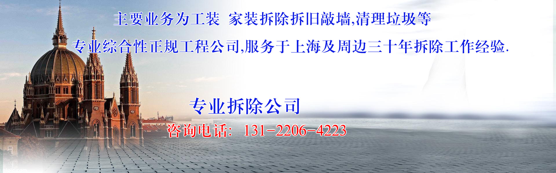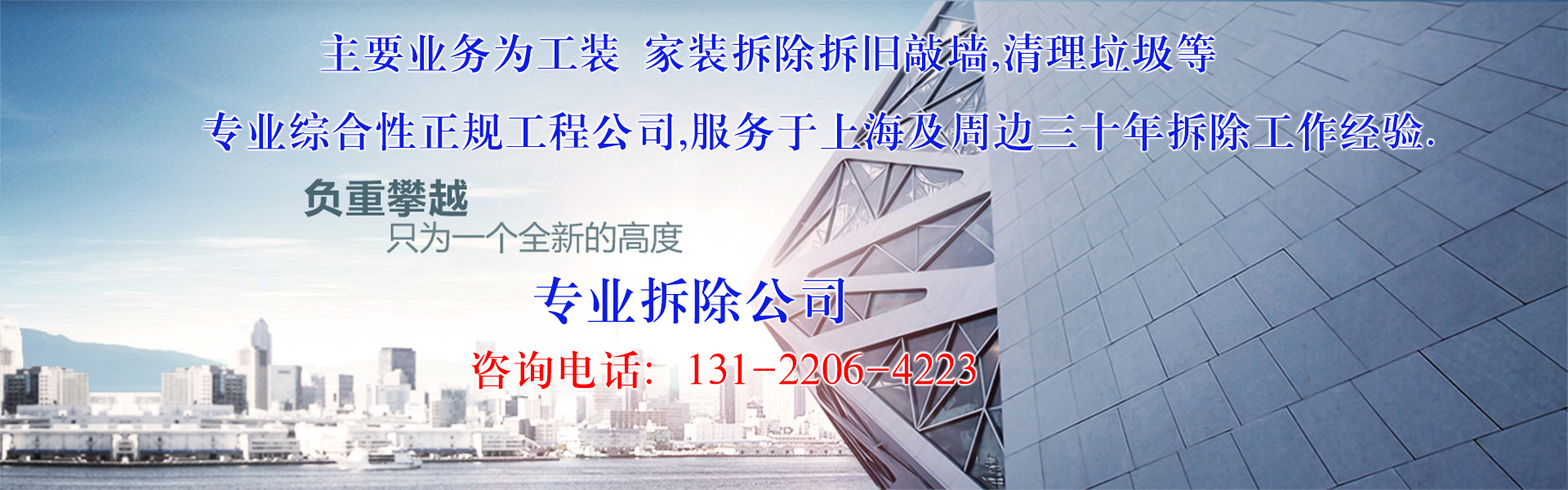 上海家盛建筑拆除工程有限公司是专业从事建筑物拆旧拆除改造、垃圾清运的正规公司企业。专业拆除、拆旧敲墙。公司拥有大量先进的机械设备以及一批施工经验丰富的工程人员,为您提供专业而优质的服务。30多年来,我公司承接了大量的施工项目,其中包括重点、大型、高难度工程,安全施工、高效、快捷的特点得到了广大客户一致好评。秉承"服务建筑,造福大众"的理念,把环保意识融入工程施工的每一环节。有专业人员拆除室内一切结构,还原毛坯房。机械拆除楼房及大型厂房,负责垃圾拖运并清理现场。施工时会针对不同环境和需求设计独立的施工方案,噪音小,安全,为您带来专业的作业机械和具有丰富工作经验队伍需要。质量保证,服务至上,价格底!合作愉快。